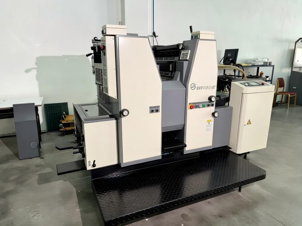 Тази офсетова печатна преса за двуцветен печат с бърза смяна на печатна форма A2 поддържа хартия с размер A2 плюс. Това е двуцветен търговски офсетов модел. Има тежка структура. Той използва дизайн на подаване с въртящо се рамо. Хващачите с двойна пружина помагат на хартията да се движи гладко. Печата бързо върху различни дебелини хартия. Включен е интелигентен сензорен екран. Операторите могат да управляват машината с лекота.