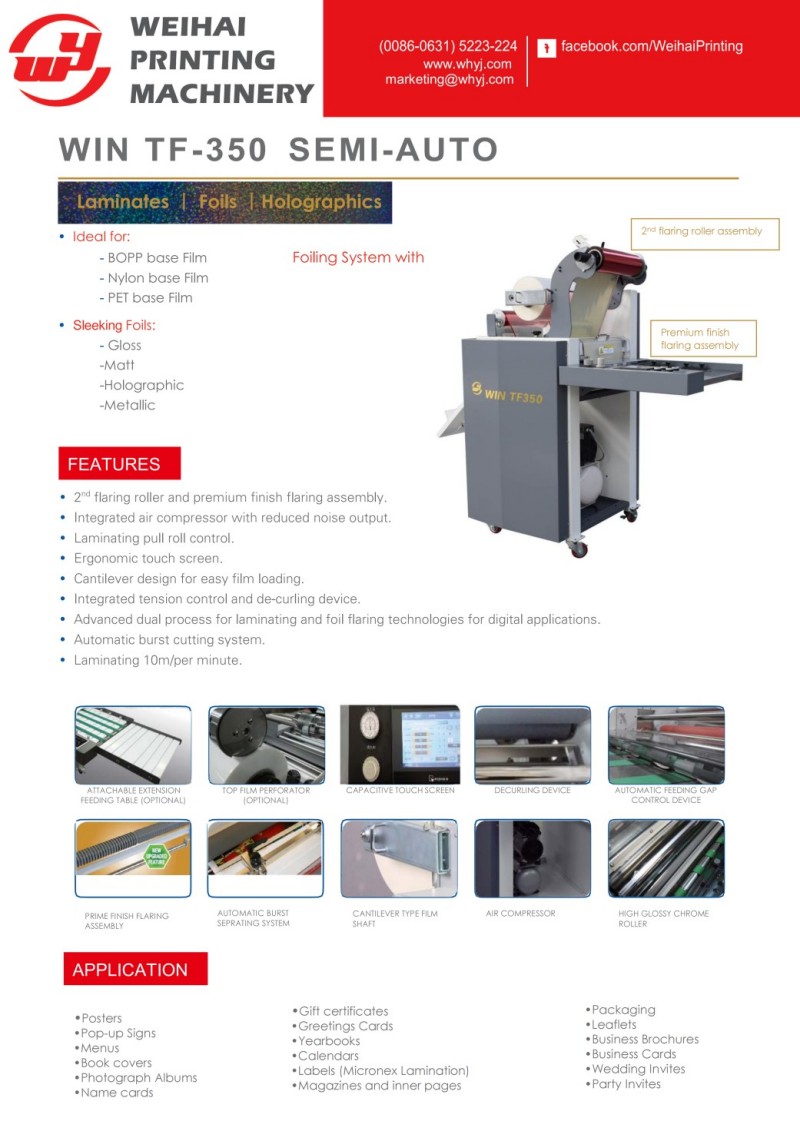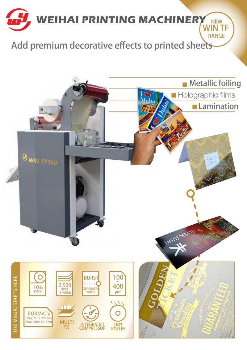 WIN предоставя професионална машина за ламиниране и фолиране (TF350/ATF380), наричана още машина за ламиниране и фолиране без изработка на плочи, която се свързва безпроблемно с цифрова преса и дигитална мастиленоструйна преса с листово подаване. Това високоефективно оборудване за следпечат интегрира функции за ламиниране, топъл печат и студено фолиране. Може да нанася гланцови, матови и лазерни фолиа, както и прецизно щамповане с метално фолио с едно минаване. С прецизен контрол на температурата и налягането, тази машина за ламиниране и фолиране осигурява ефекти на щамповане без мехурчета, без изкривяване и здрави. Поддържа автоматично подаване на хартия, стабилно транспортиране и високо прецизна регистрация, което значително подобрява външния вид и добавената стойност на печатните продукти. Издръжлива и лесна за работа, тази машина за ламиниране и фолиране се използва широко за висококачествени визитни картички, подаръчни кутии, сертификати, корици на книги и висококачествени рекламни материали.